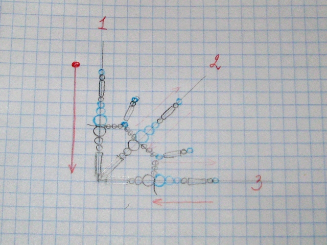 2. Принцип плетения: снежинка состоит из 8 лучиков. Первый лучик начинается с верхушки. Набираем на проволоку бисер, бусинки и стеклярус в таком порядке, как на фото (схема).