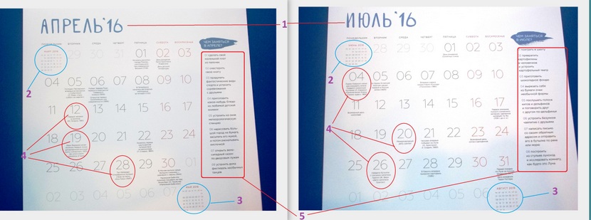 Разворот календаря имеет 2 страницы. На одной – очередная история Филиппа, на другой – сам календарь с датами и массой творческих заданий. В июле можно вспомнить (или выучить) и спеть песню из мультика про голубой вагон, покрасить бусины и флажки в три разных оттенка голубого, найти все предметы голубого цвета в округе. В октябре – собрать коллекцию осенних листьев оранжевого цвета, вспомнить названия всех фруктов аналогичного оттенка, а из тыквы – соорудить фонарик Джека.