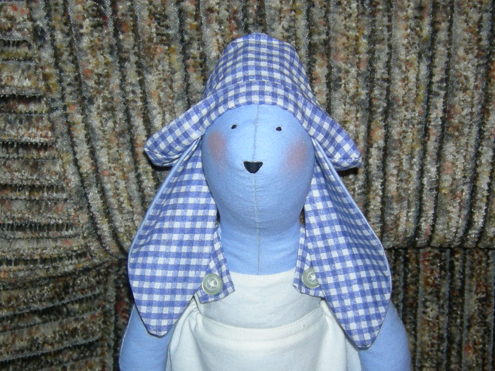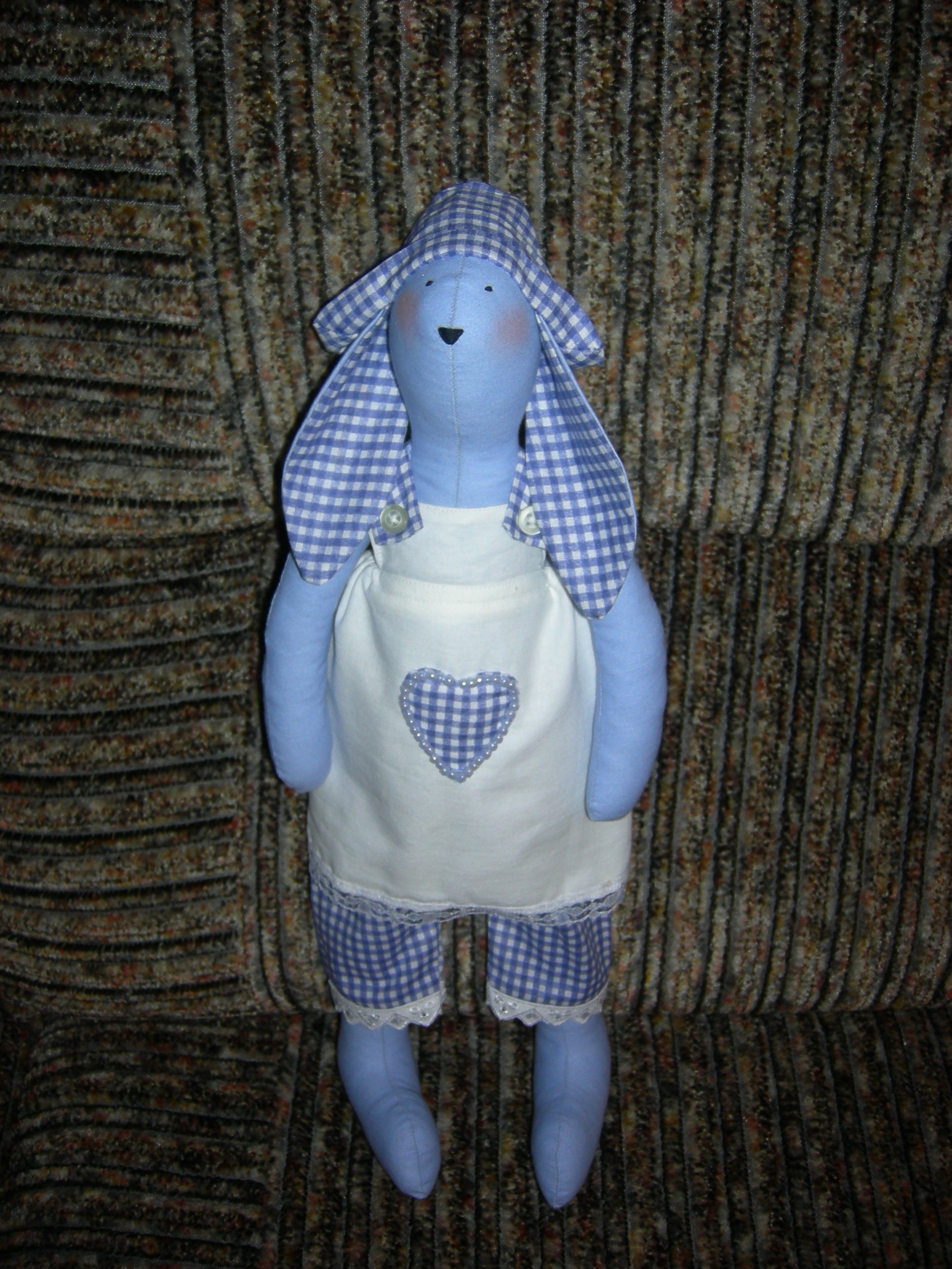 Правда, цвет у кролика нестандартный – голубой, но у меня ткани другого цвета не было (да и эта была кусочками и с рисунком, хорошо хоть рисунок редкий). Но голубые Тильда-Кролики смотрятся очень прелестно (я в инете подглядела).